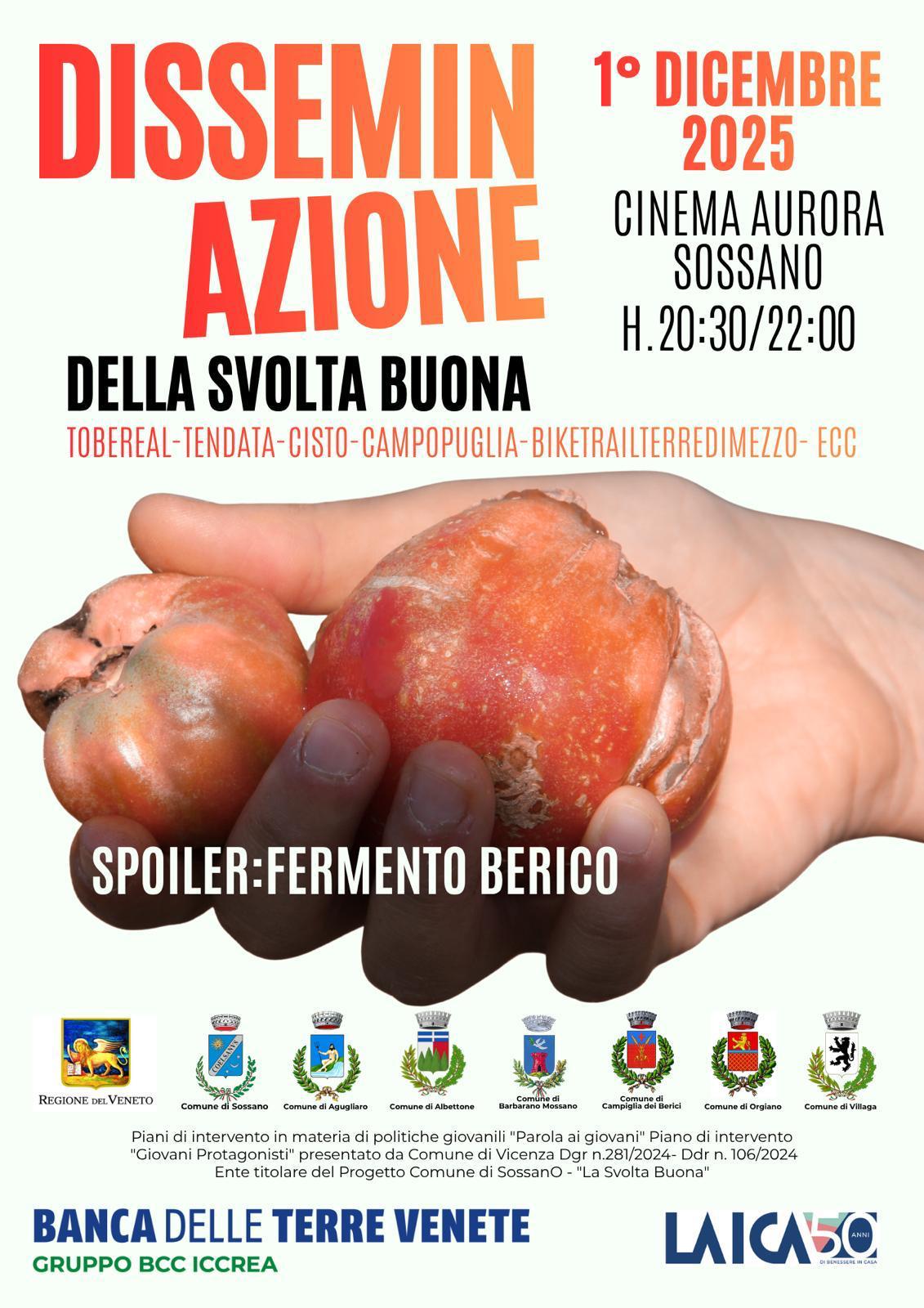 Tutta la cittadinanza (giovani, famiglie, associazioni, amministratori, insegnanti, stakeholder) è invitata alla serata conclusiva de “La Svolta Buona”, progetto del 2025 in materia di Politiche Giovanili (finanziamento regionale Piani di intervento in materia di politiche giovanili “PAROLA AI GIOVANI”) realizzato dal Comune di Sossano quale capofila in rete con i comuni di Agugliaro, Albettone, Barbarano Mossano, Campiglia dei Berici, Orgiano, Villaga e con il sostegno di Banca delle Terre Venete e di Laica spa.